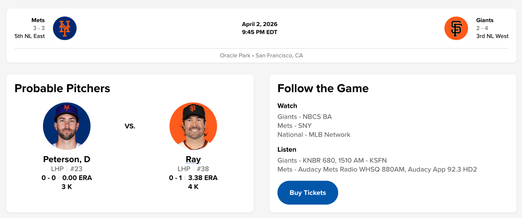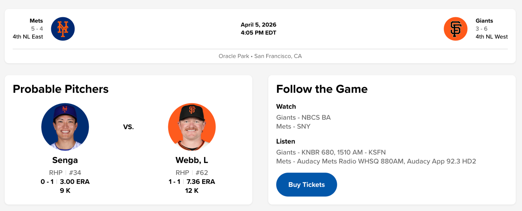 Mets (Senga) vs Giants (Webb): 4/5/26, 4;05pm